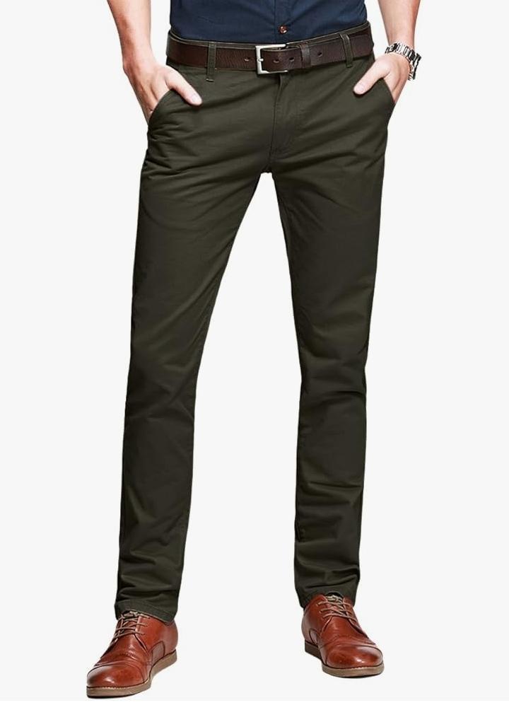 Our Jungle Khaki Men's Trousers Features zipper fly and button closure, front slant pockets, fifth-coin pocket at waistband, and classic back welt pockets Fitted through hip and thigh, with tapered leg. Sits below the waist Straight leg: Straight through the seat and thigh with straight leg opening Classic style: Soft, high quality fabric, very comfortable to wear